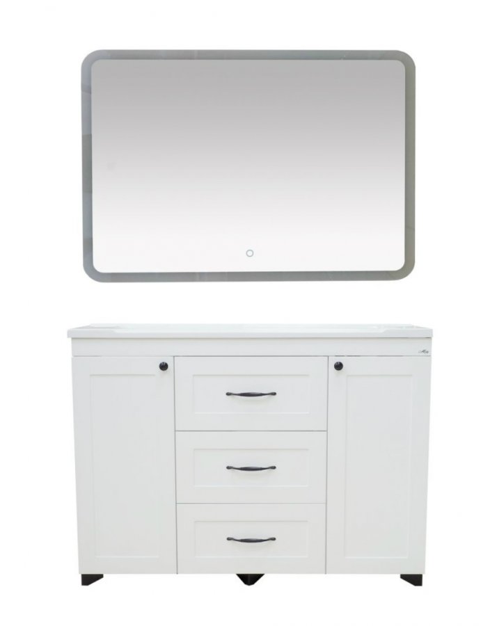 Комплект для ванной мебели Misty Дуэт 120 с 3 ящ. белый матовый – это удобная и функциональная мебель, предусматривающая вместительную зону хранения и практичную организацию для максимально комфортного использования. Напольная тумба с двумя симметричными распашными дверками и тремя центральными выдвижными ящиками имеет встроенную высококачественную раковину с вкладышем из искусственного камня. Помимо отменных функциональных характеристик, модель отличается стильным дизайном. Элегантные классические фасады в рамку акцентированы утонченными ручками черного цвета, сверху размещается широкое светодиодное зеркало с сенсорным выключателем.