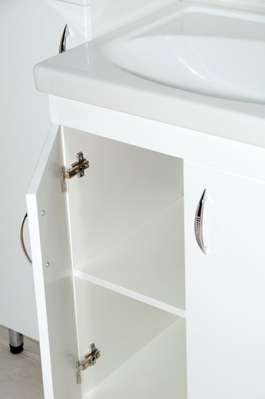 Комплект мебели Misty Калипсо 70 прямой белый – это лаконичный и практичный способ обустройства ванной комнаты. Заложенный в основе классический двустворчатый принцип построения конструкции, как всегда, прост и удобен в быту. За распашными отделениями установлены функциональные полки из ЛДСП для бережного хранения. Напольная тумба с накладной раковиной из фаянса гармонично сочетается с минималистичным зеркальным шкафом.