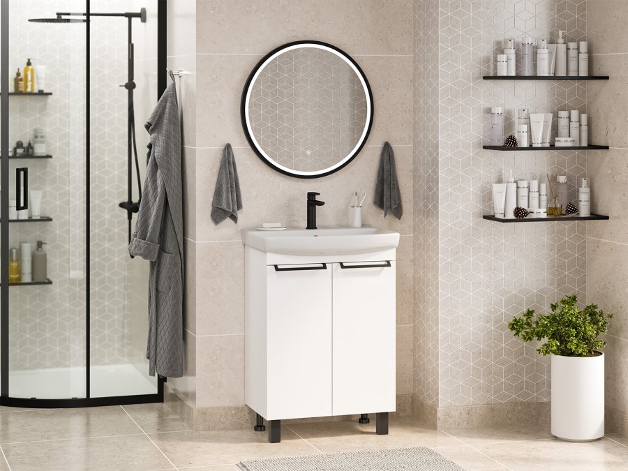 Напольный комплект мебели Misty Клермонт 60 имеет лаконичный белый цвет с акцентными чёрными деталями. Дизайн выполнен в популярном направлении минимализм, для которого характерны простота, функциональность и современный стиль. Двустворчатый модуль тумбы с керамической полукруглой раковиной имеет внутри полки для скрытого хранения. Тумба эффектно дополняется круглым светодиодным зеркалом, имеющим сенсорный выключатель прямо на панели.