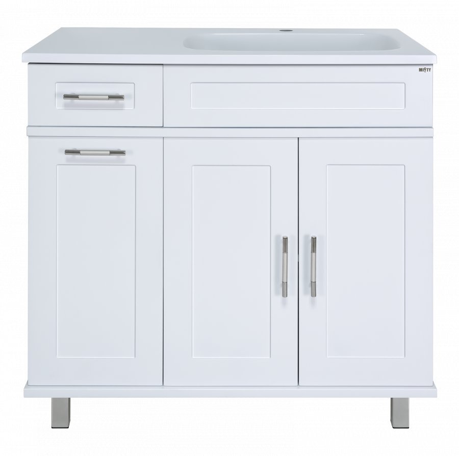 Комплект мебели Misty Купер 90 R с б/к белый эмаль – это модель с лаконичным классическим дизайном и современным функциональным исполнением. Выполненный из МДФ с влагостойким эмалевым покрытием, набор оснащён прямоугольным зеркалом в раме из коллекции «Шармель» и имеет многофункциональную вместительную тумбу с асимметричной раковиной правого расположения. Функциональная «начинка» тумбы представлена просторным распашным отделением с вкладной полкой, небольшим выдвижным ящиком и бельевой корзиной, установленной в боковой секции с откидывающимся механизмом.