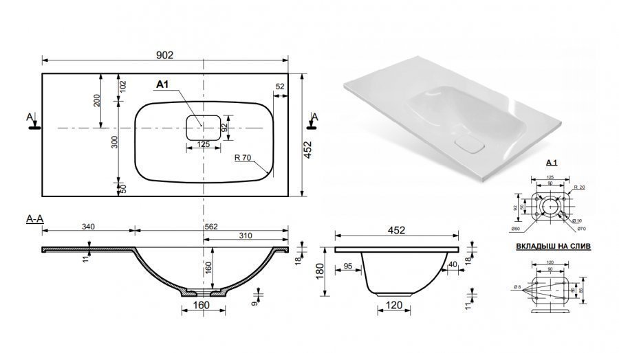- Раковина "Барселона" - 90 см" правая (ш/в/г): 902x180x452 мм