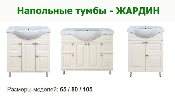 Уважаемые посетители нашего интернет-магазина, рады представить Вашему вниманию нашу новинку – напольные тумбы Жардин, идущие в комплекте вместе с раковинами. Линейка представлена тремя популярными размерами – 65, 80 и 105 см.